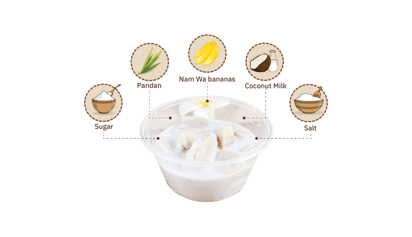 is a traditional Thai dessert made from ripe Nam Wa bananas cooked gently in rich coconut milk, sweetened with palm sugar, and balanced with a pinch of salt. Pandan leaves are often added for extra aroma. The bananas become soft and tender, while the coconut milk turns creamy and fragrant. It’s a simple yet comforting dessert that showcases classic Thai flavors.