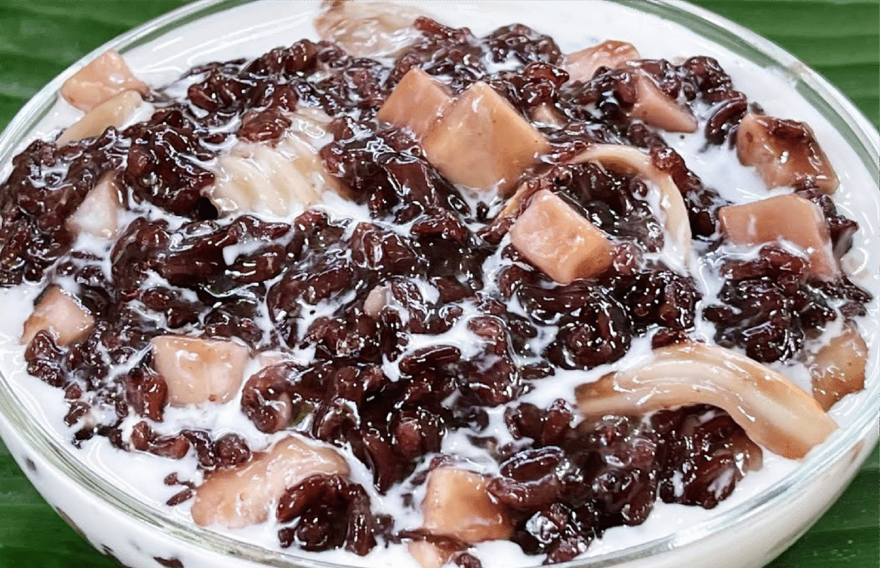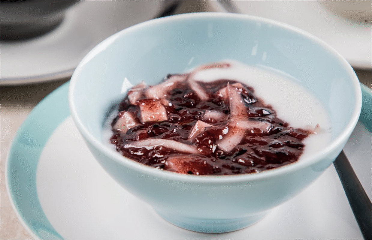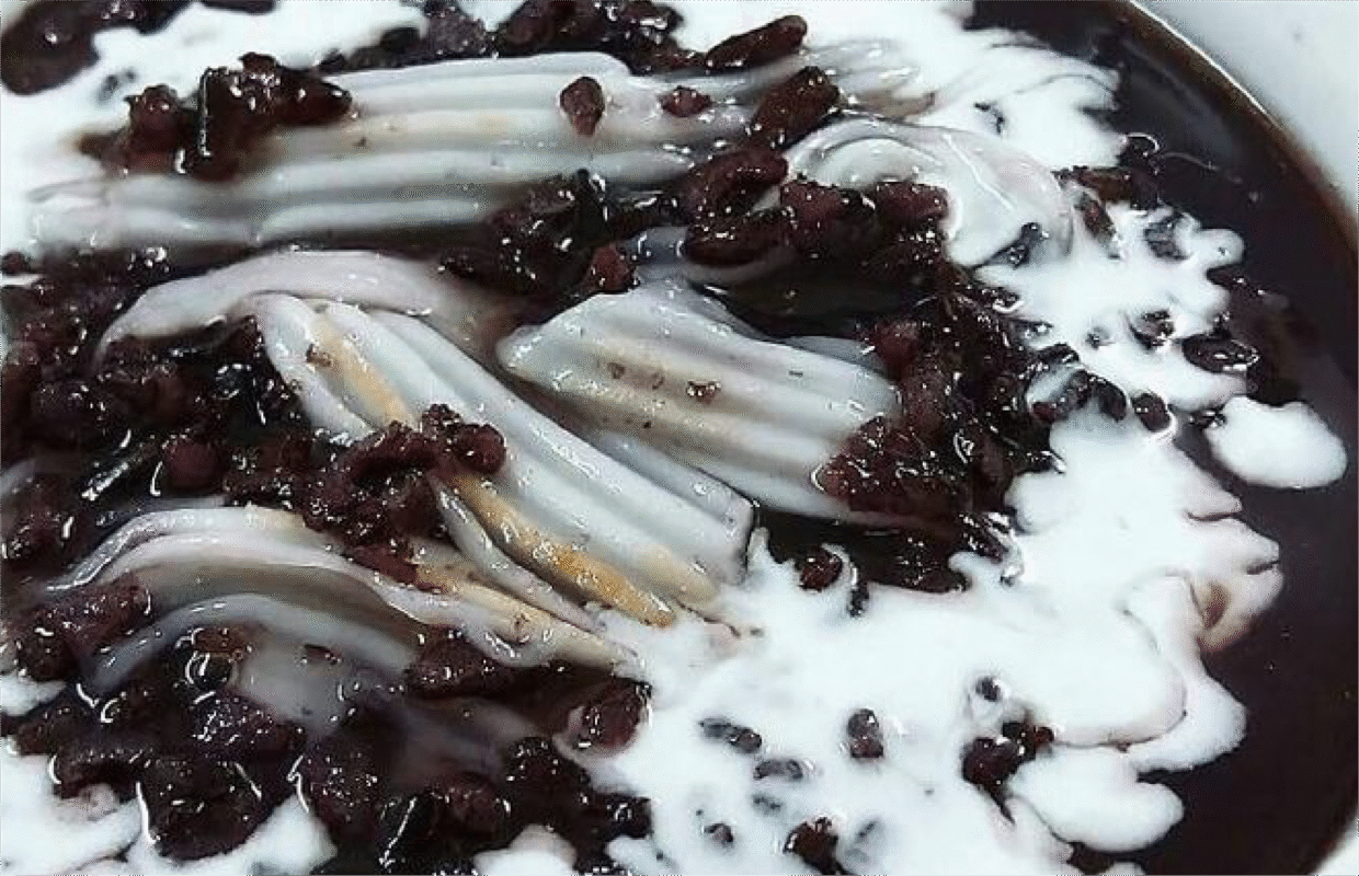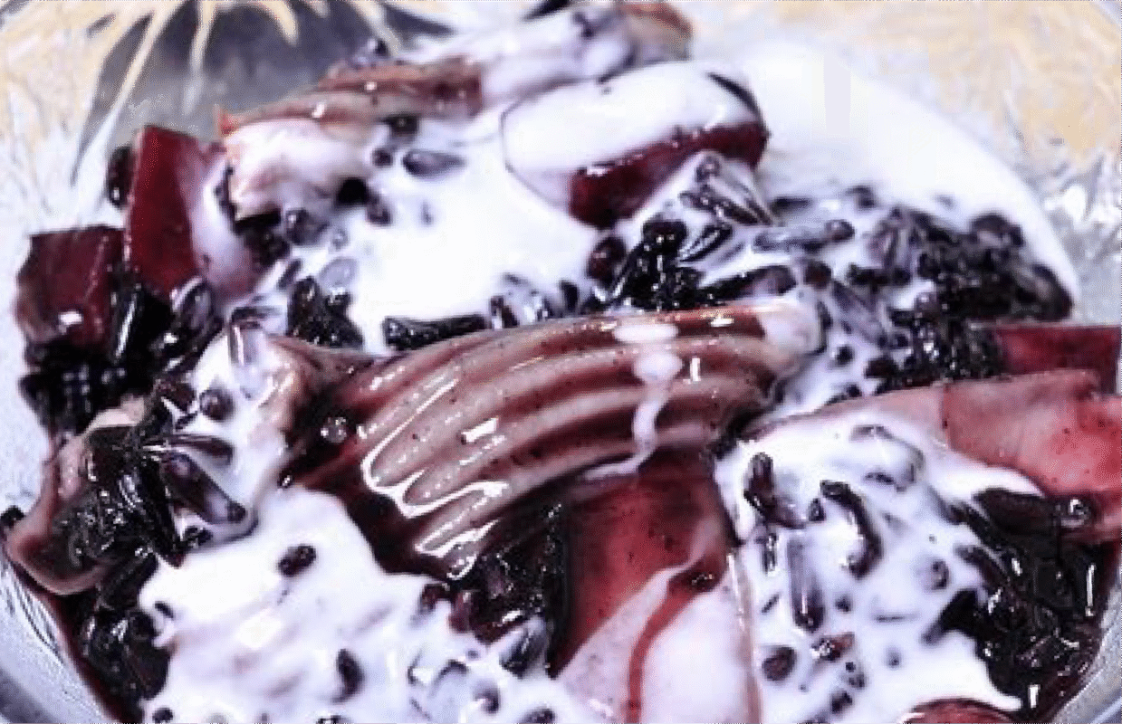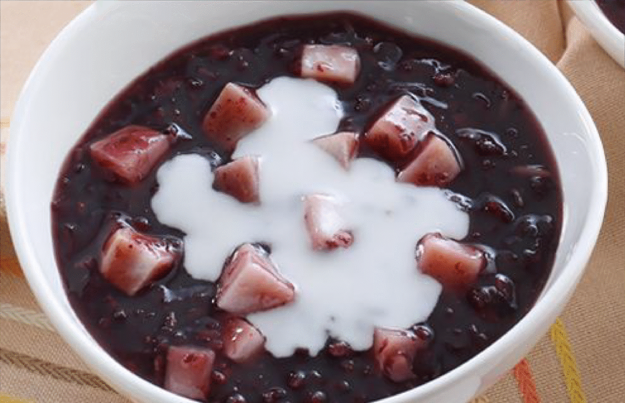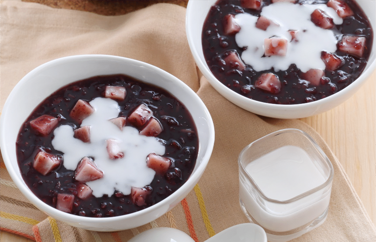 Each tiny grain of black glutinous rice is carefully simmered until tender, yet still retains its signature chewy texture. Its glossy, deep purple hue glistens like a precious gem in a white porcelain bowl. Nestled within are soft cubes of taro — smooth, fragrant, and delicately rich. With every spoonful, the gentle softness of the taro entwines with the subtle chewiness of the rice, like a tender conversation between two textures in perfect harmony.