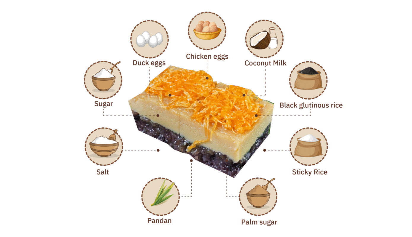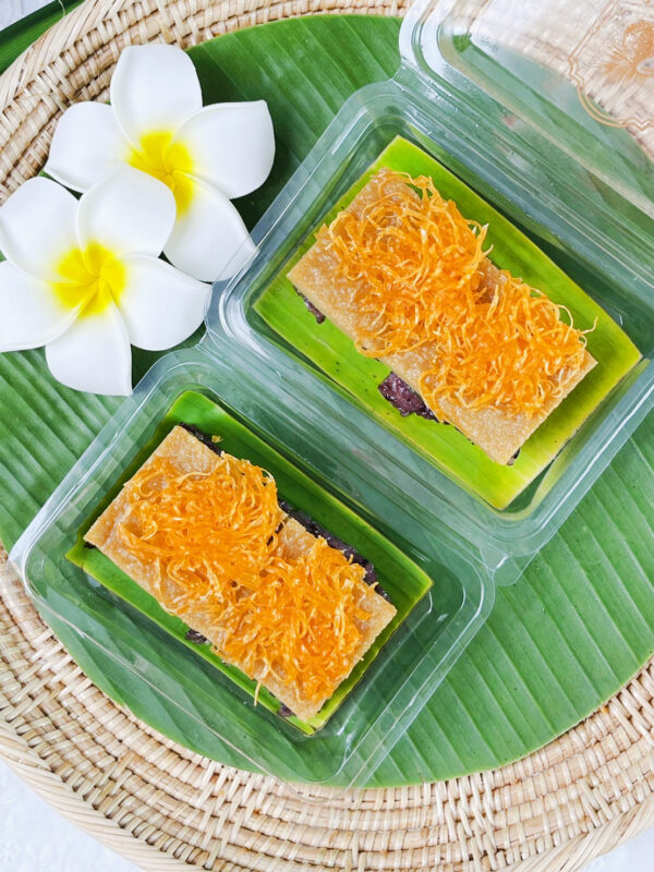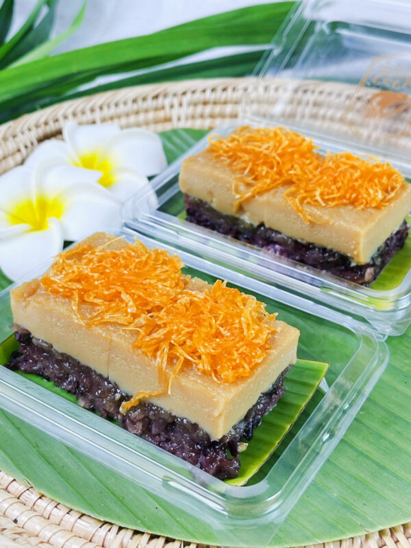 is a Thai dessert made from black sticky rice cooked with coconut milk until soft and chewy, cut into pieces, then topped with smooth custard and sweet golden egg threads. It offers a rich, aromatic flavor and an attractive presentation.