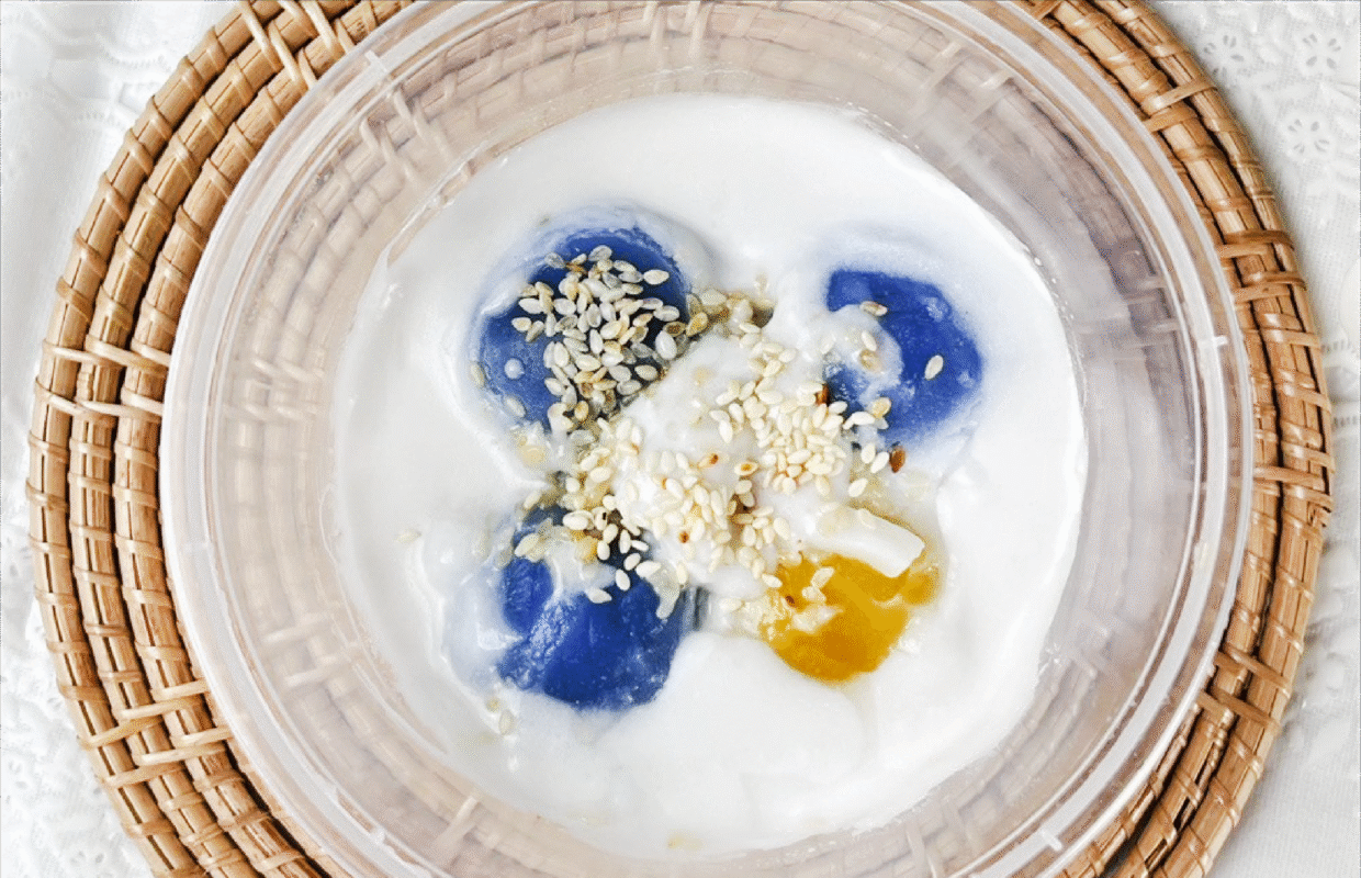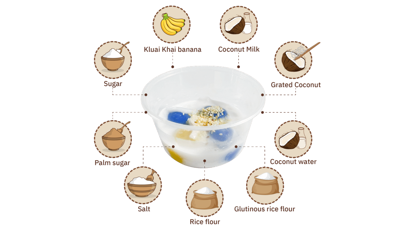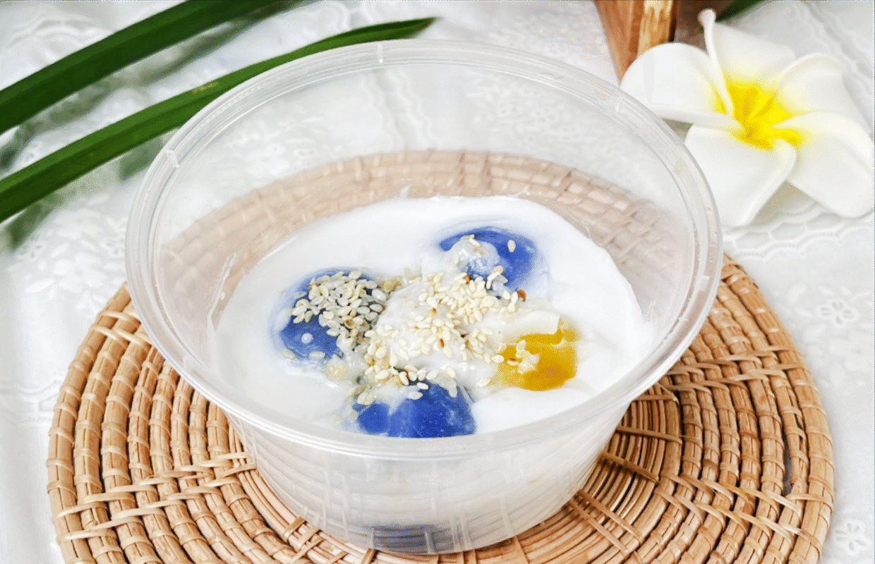 is a traditional Southern Thai dessert made from glutinous rice dough filled with palm sugar, shaped into small balls, and boiled until cooked. It is then served with sweet, lightly salted coconut cream. The dessert features a soft, chewy texture with a fragrant, rich flavor from coconut and palm sugar. It is often prepared for merit-making and festive occasions, symbolizing unity and warmth in Thai family life.