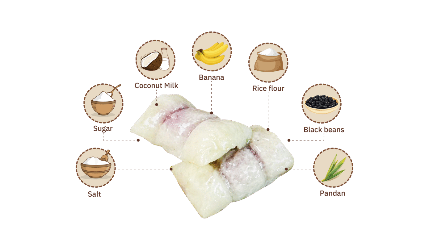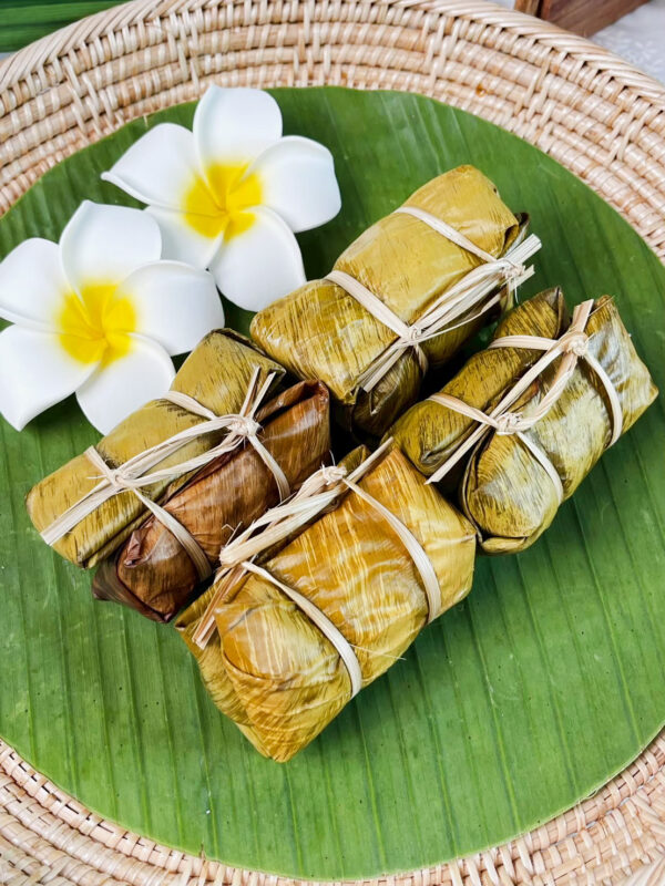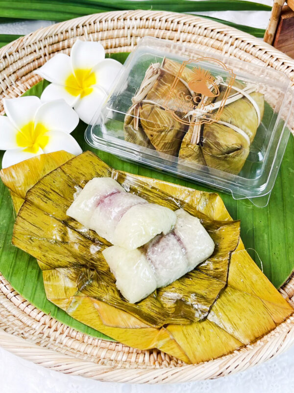 is a traditional Thai dessert commonly made during religious festivals and merit-making ceremonies, especially during Buddhist Lent. It is made from sticky rice mixed with coconut milk and a pinch of salt, then wrapped in banana leaves with a filling of ripe Nam Wa banana and sometimes black beans for added flavor and texture. The parcels are tied in pairs with bamboo strings and steamed until fully cooked.