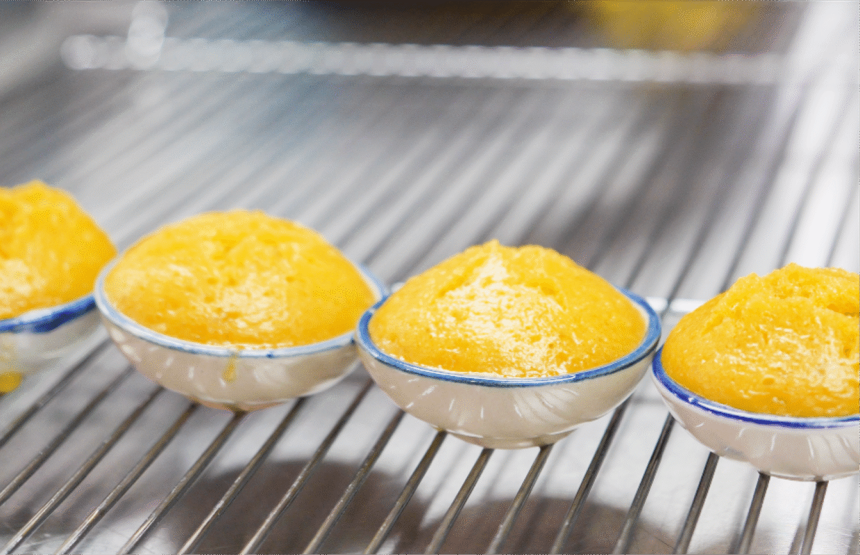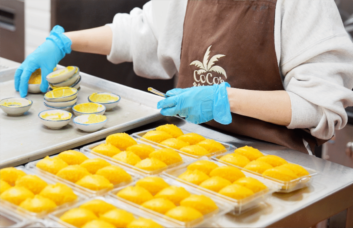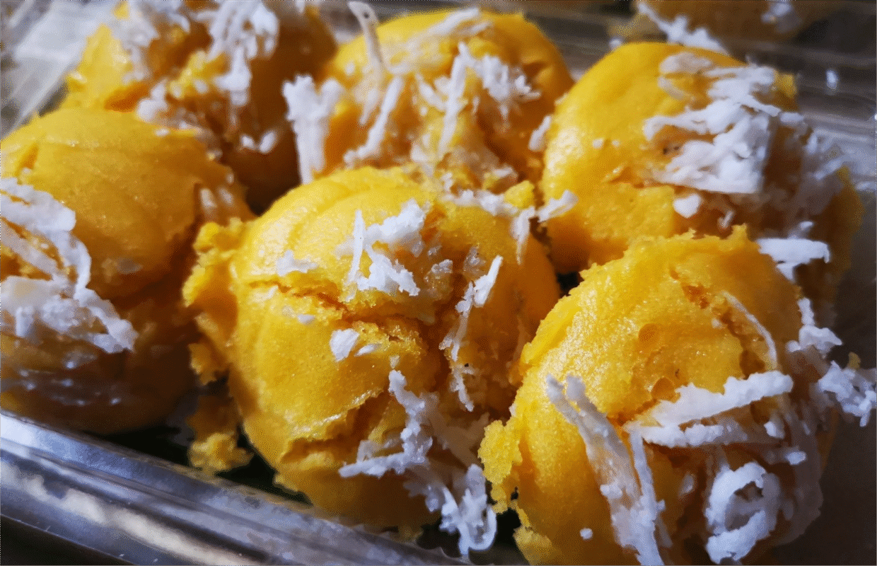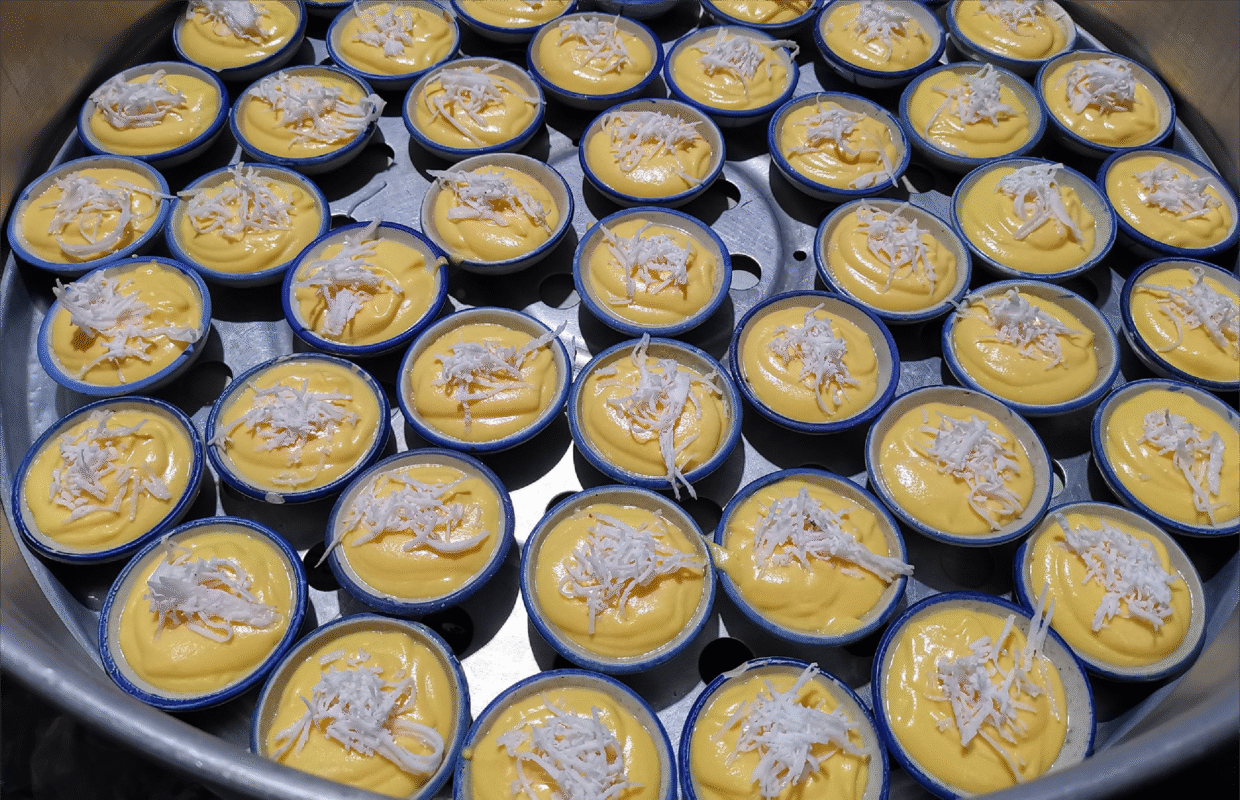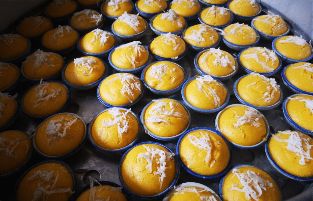 Kanom Tan (Palm Cake): Our Kanom Tan features a soft, fluffy texture with a slight chewiness. We carefully select premium palm fruit pulp from the best sources in Thailand and mix it with our shop’s special flour recipe. The mixture is then steamed until perfectly cooked, resulting in a beautiful golden-yellow color and a delightful aroma.