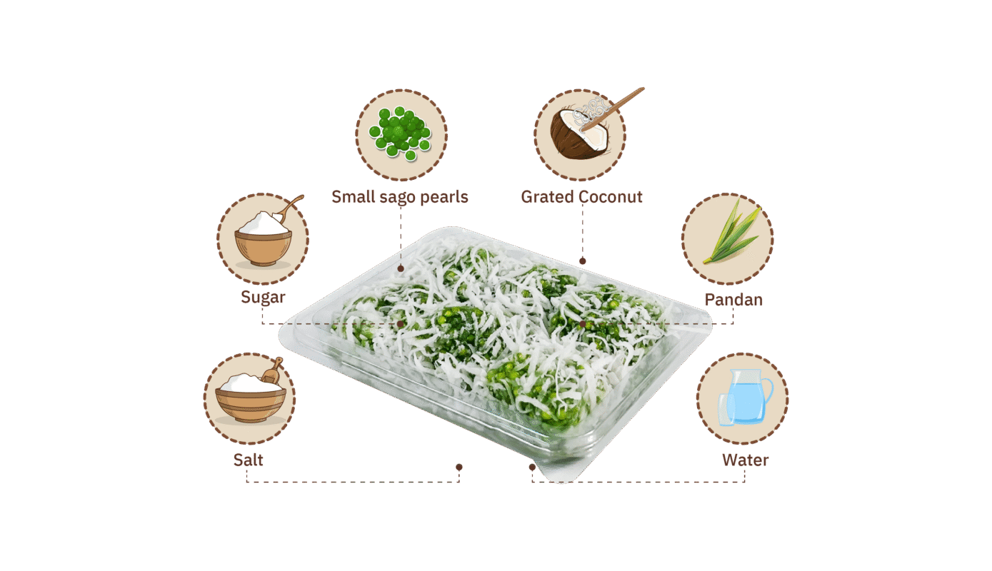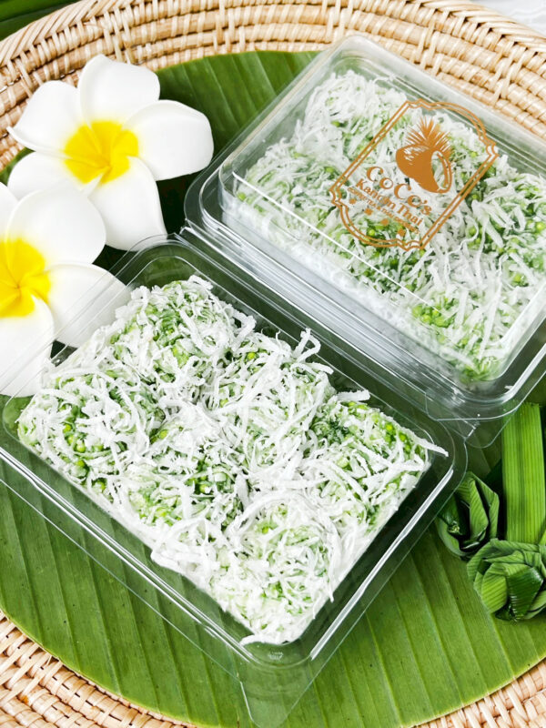 Khanom Yok Manee has a soft, chewy, and glossy texture. The small, glistening pieces are coated with grated coconut lightly mixed with salt, creating a perfect balance of sweet and savory flavors.