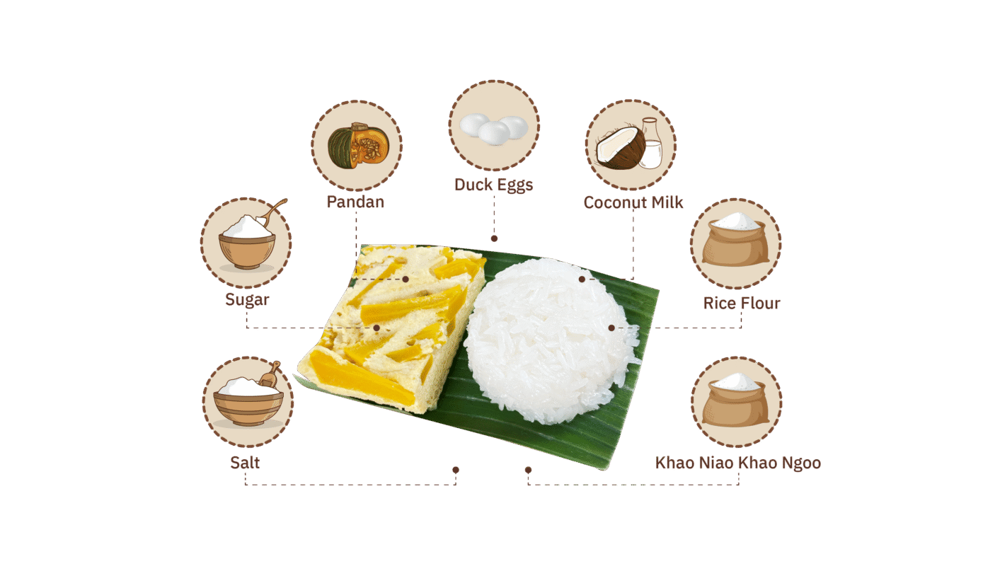 is a traditional Thai dessert known for its sweet, creamy flavor and soft, chewy texture. The sticky rice is cooked with coconut milk and sugar until fragrant and tender. The pumpkin custard is made from mashed pumpkin mixed with eggs and sugar, giving it a smooth texture and a vibrant orange color.