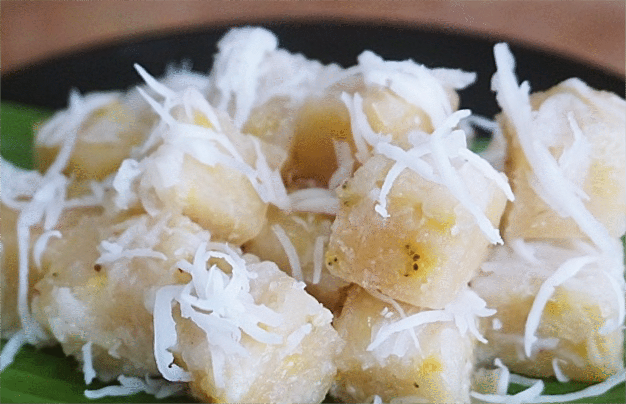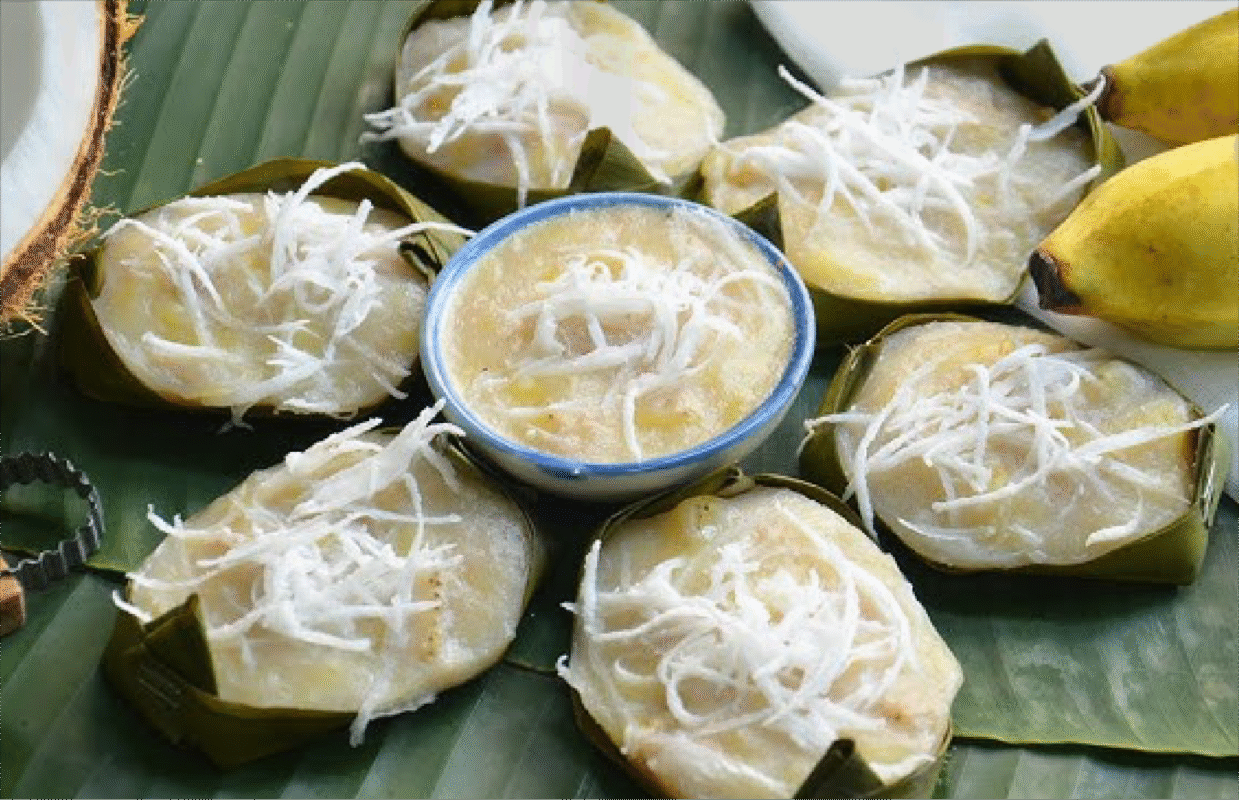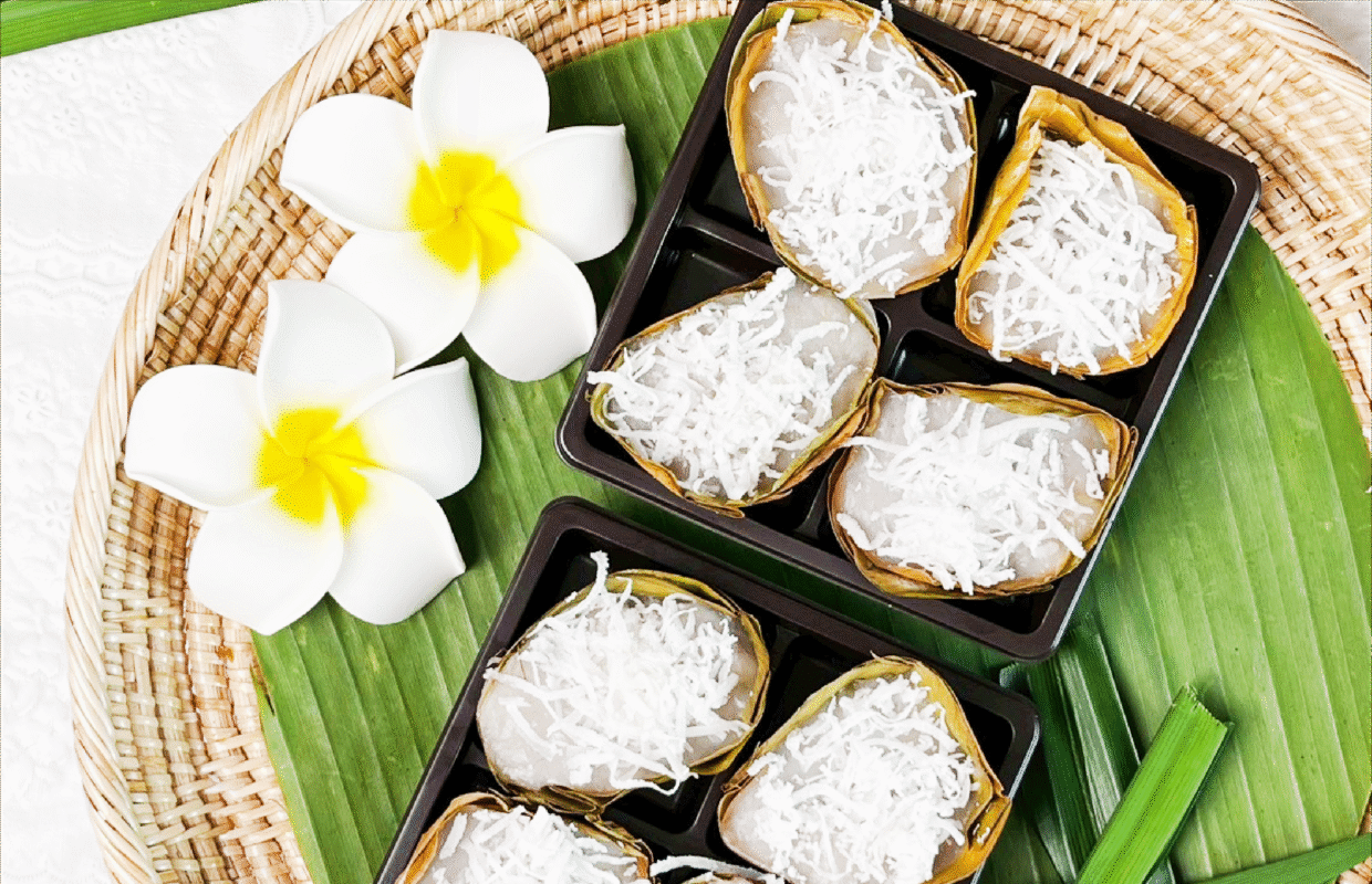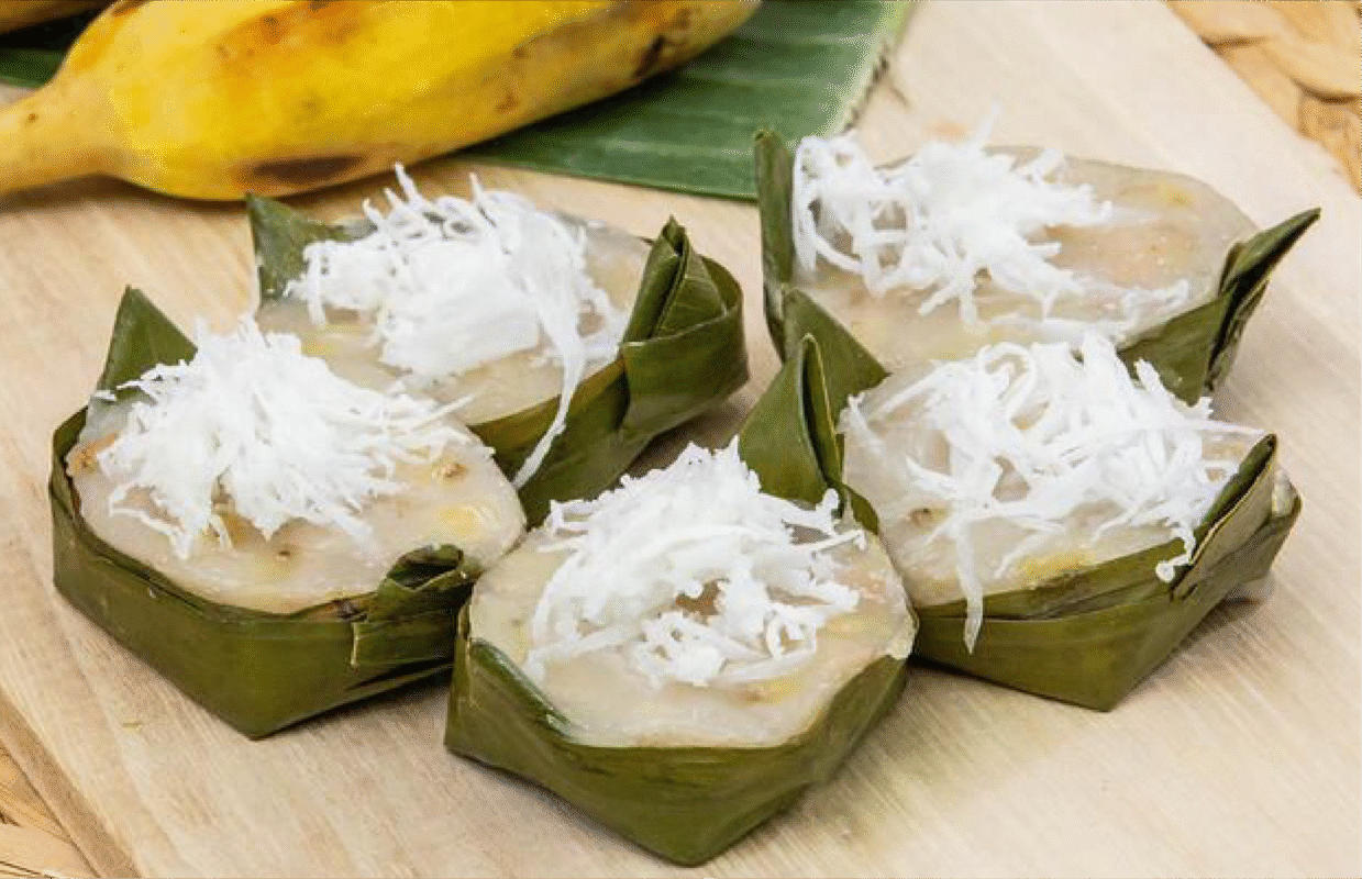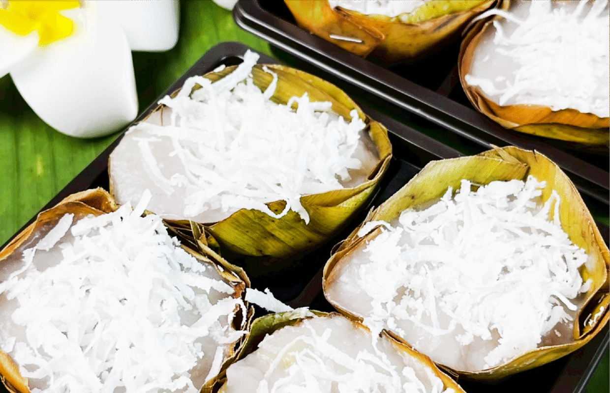 This traditional Thai dessert is made from ripe Namwa bananas that are mashed until smooth, releasing their naturally sweet aroma. The mashed bananas are then mixed with rice flour, tapioca flour, sugar, and rich coconut milk, before being wrapped in banana leaves and steamed until perfectly cooked. As the steam rises, the fragrance of banana mingles with the warm scent of the leaves, filling the air with a nostalgic sweetness that recalls the comforting warmth of an old Thai kitchen.