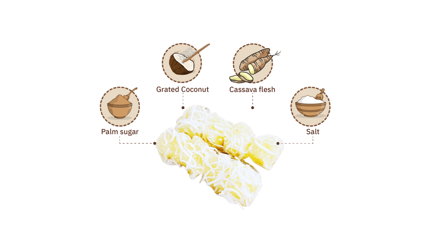 ขนมนี้ทำจาก มันสำปะหลังขูดละเอียด คลุกเคล้ากับ น้ำตาลทราย เกลือเล็กน้อย และน้ำใบเตยหอม ก่อนจะนำไปนึ่งจนเนื้อขนมสุกใส เหนียวนุ่ม เย็นตาและชวนชิม เมื่อสุกแล้วจึง โรยมะพร้าวทึนทึกขูด เพิ่มความมันและกลิ่นหอมละมุน ให้รสชาติกลมกล่อม หวานพอดี เคล้าความเค็มมันจากมะพร้าวอย่างลงตัว