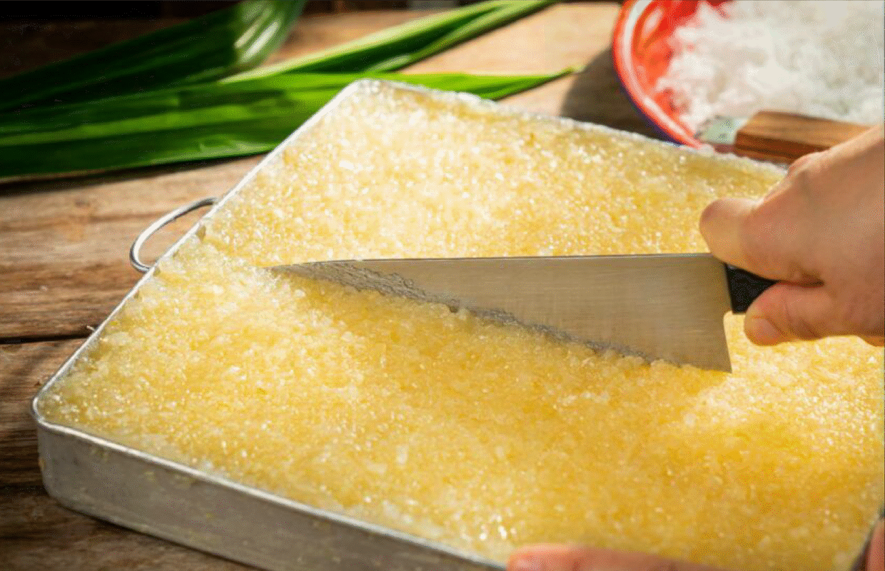 This dessert is made from finely grated cassava mixed with sugar, a pinch of salt, and fragrant pandan juice. The mixture is then steamed until it becomes translucent, soft, and delightfully chewy. Once cooked, it is topped with grated mature coconut, adding a rich aroma and creamy flavor that perfectly balances the gentle sweetness and a hint of saltiness.