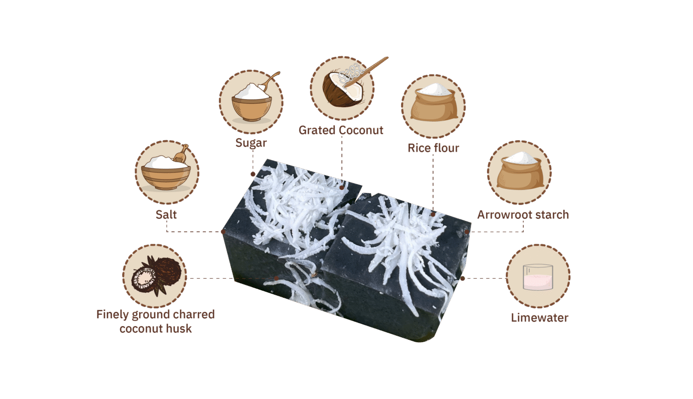 is a traditional Thai dessert known for its dark blackish-green color, unique aroma, and rich, smooth texture. The distinctive color comes from a mixture of clear lime water, coconut milk, palm sugar, and sometimes burnt coconut shell juice or concentrated pandan extract. These ingredients give the dessert its fragrant, slightly smoky sweetness.