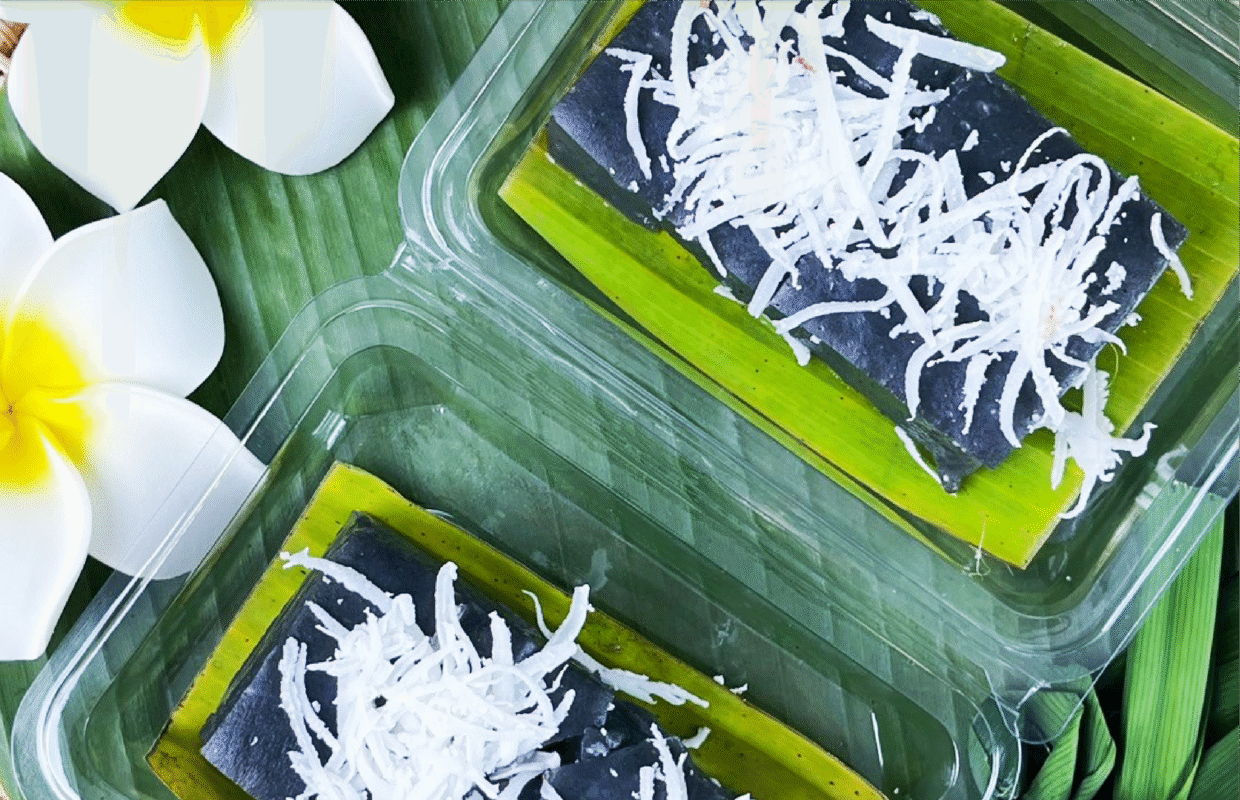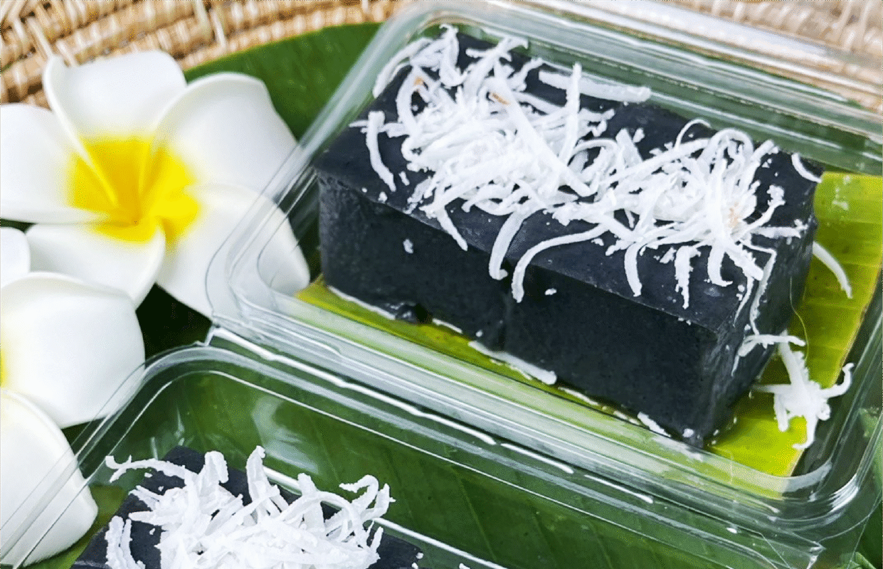 The texture of Khanom Piak Poon Dam is soft, sticky, and slightly chewy, similar to a dense jelly. It is often served with grated coconut mixed with a pinch of salt, which balances the sweetness perfectly.
