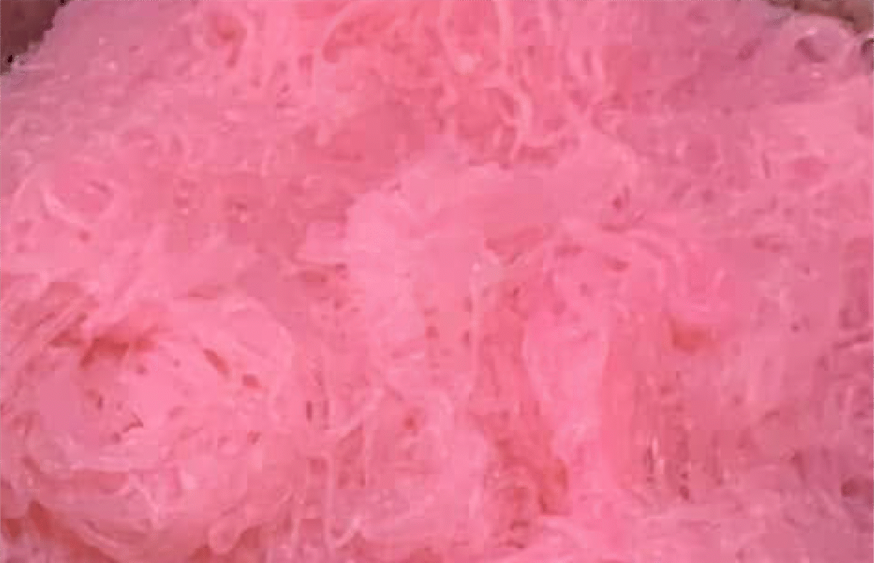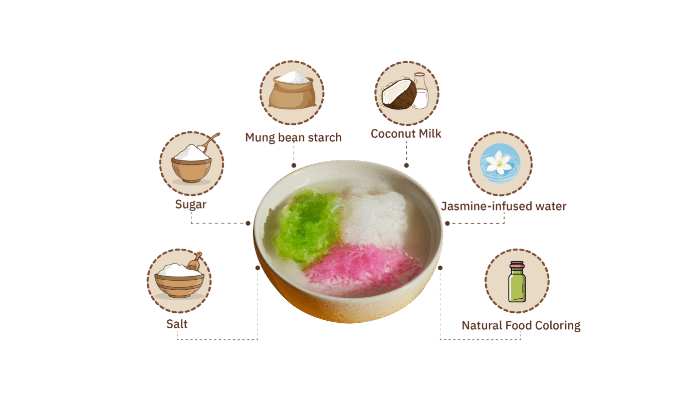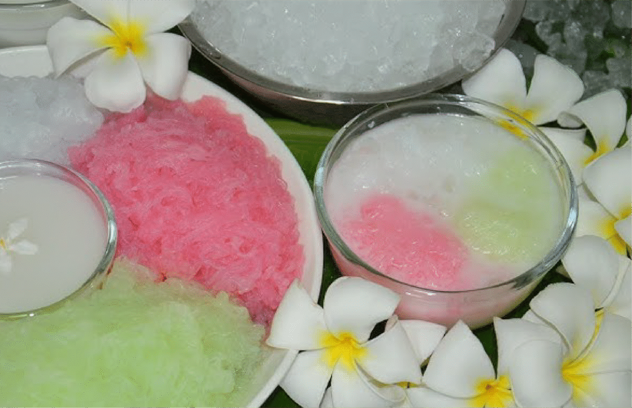 It is a traditional Thai dessert with bright and attractive colors. The dessert consists of small, jelly-like strands similar to lod chong (Thai pandan noodles), made from mung bean starch mixed with various colors and pressed through a mold into cold water to form soft and chewy strands. It is served with rich, fragrant coconut milk and crushed ice, giving it a sweet, creamy, and refreshing taste — a perfect treat for Thailand’s hot climate.