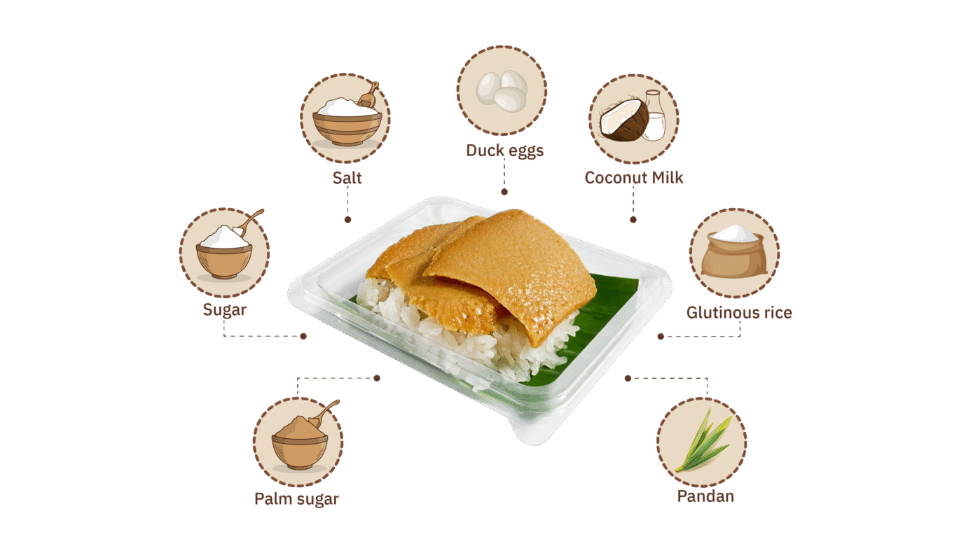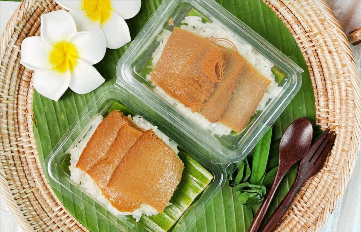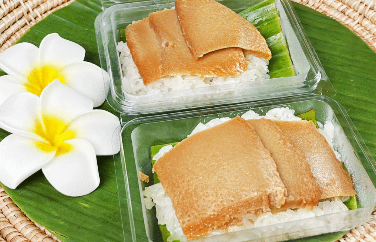 is a traditional Thai dessert known for its sweet, creamy flavor and fragrant aroma from coconut milk and pandan leaves. The dessert consists of glutinous rice cooked with coconut milk and sugar, topped with custard made from eggs, sugar, and coconut milk, resulting in a smooth and creamy texture. This dessert is commonly made for auspicious events, merit-making ceremonies, or sold in Thai markets. It reflects the careful craftsmanship and attention to detail of traditional Thai sweets.