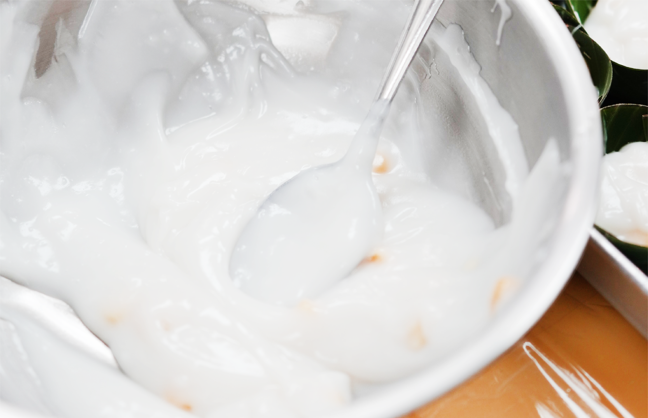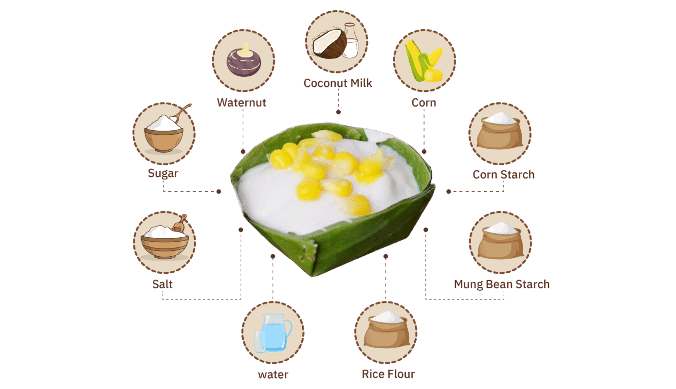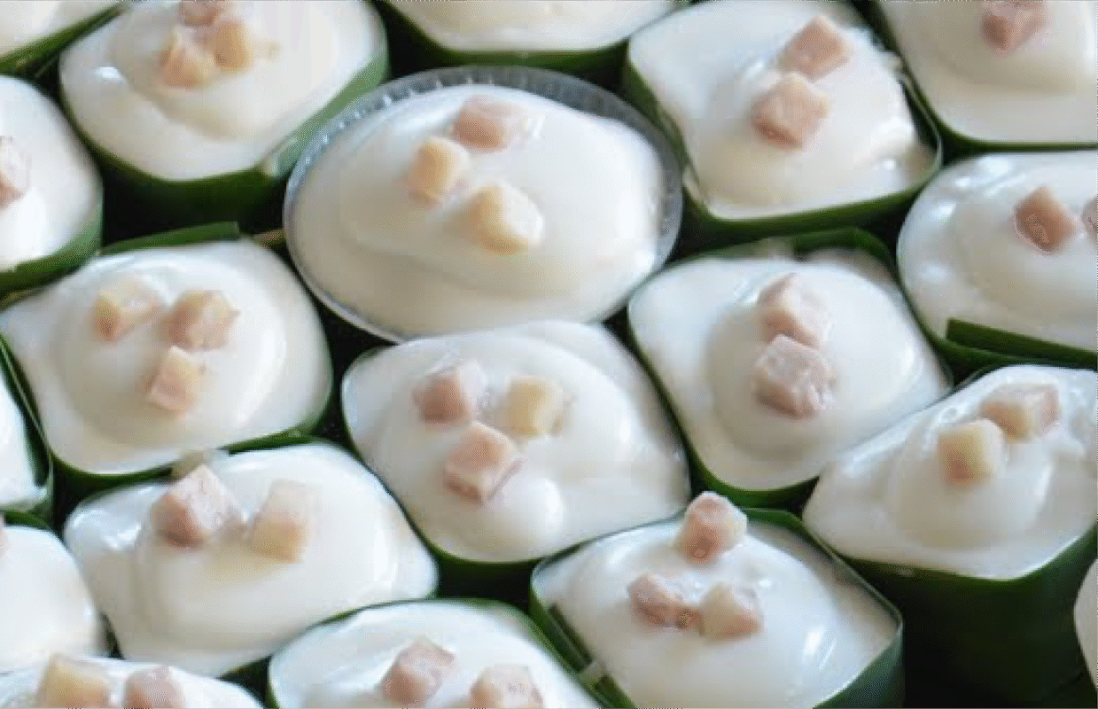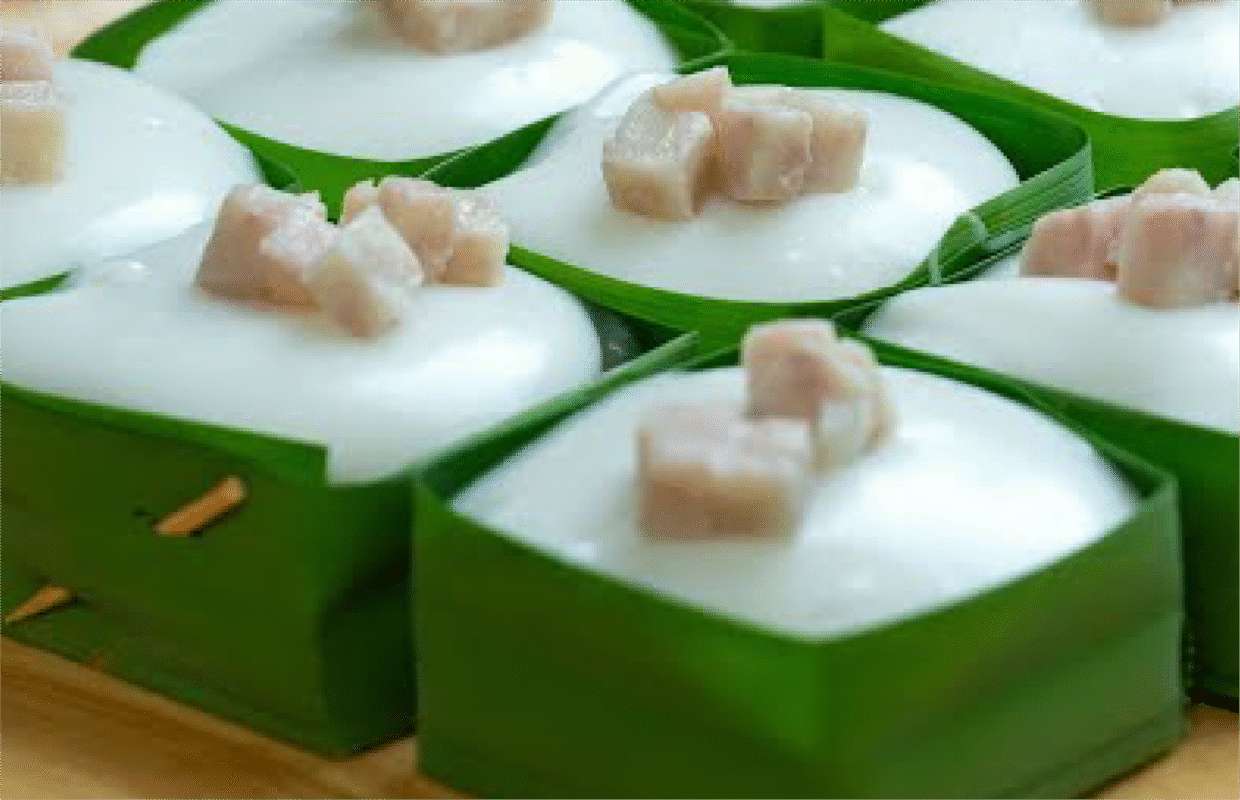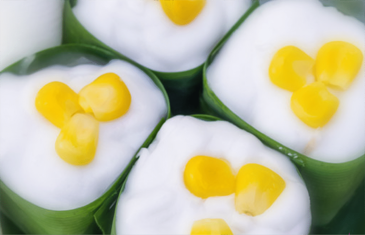 This traditional Thai dessert is wrapped in banana leaf cups and features two distinct layers with unique flavors and textures. The bottom layer is a sweet filling made from corn or water chestnuts, cooked to a perfect chewy and tender consistency with a fragrant sweetness. It is carefully scooped into the banana leaf cups. The top layer is a thick, creamy coconut custard with a smooth white color, simmered to a rich, balanced salty-sweet flavor. The dessert is garnished with corn or water chestnuts to enhance both its appearance and taste.