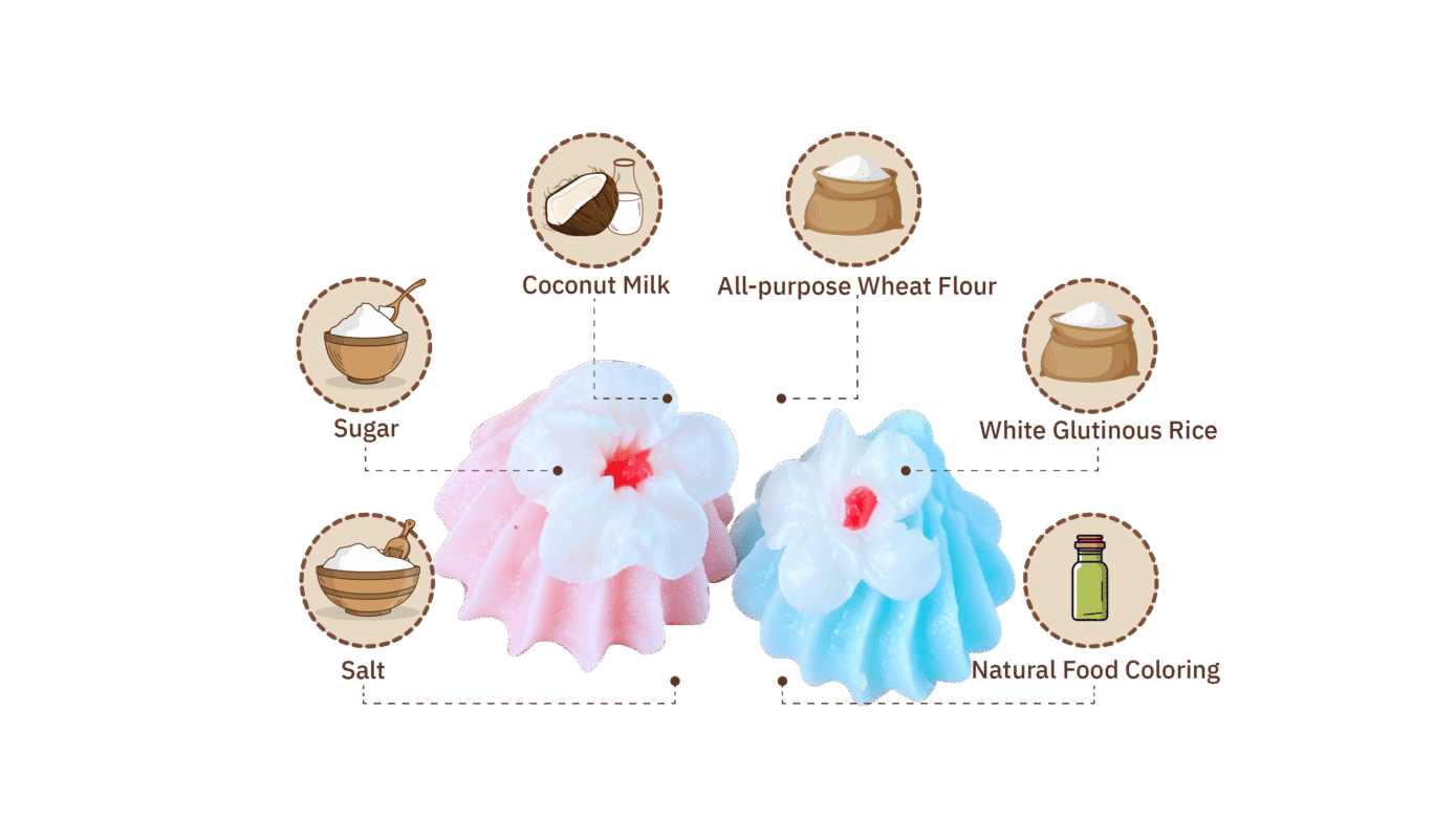 is a traditional Thai dessert made from wheat flour, sugar, and coconut milk. It comes in small, colorful pieces with a delightful texture — crisp on the outside and chewy inside. The sweet aroma of coconut milk and sugar makes it irresistible. Alua is often shaped into tiny flowers or teardrop forms and requires skillful baking to achieve its signature crispy shell and soft center. This charming sweet is commonly served during Thai festivals and special occasions as a symbol of happiness and good fortune.