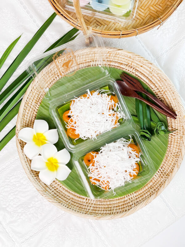 is a traditional Thai sweet made from tapioca flour shaped into small, elongated pieces resembling long fish eggs. These pieces are boiled until translucent and chewy, then served in sweet coconut milk for a rich, creamy flavor.