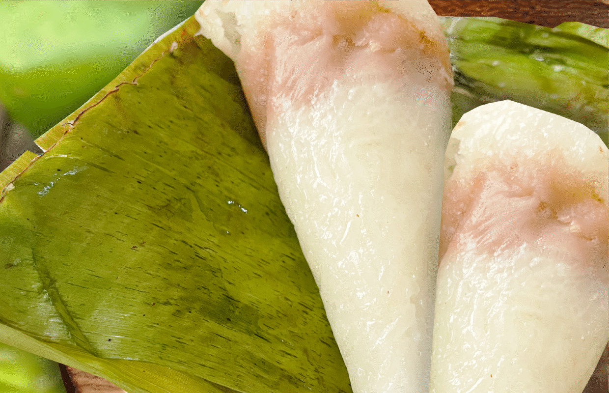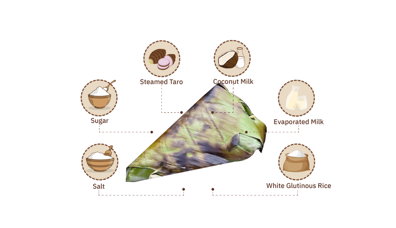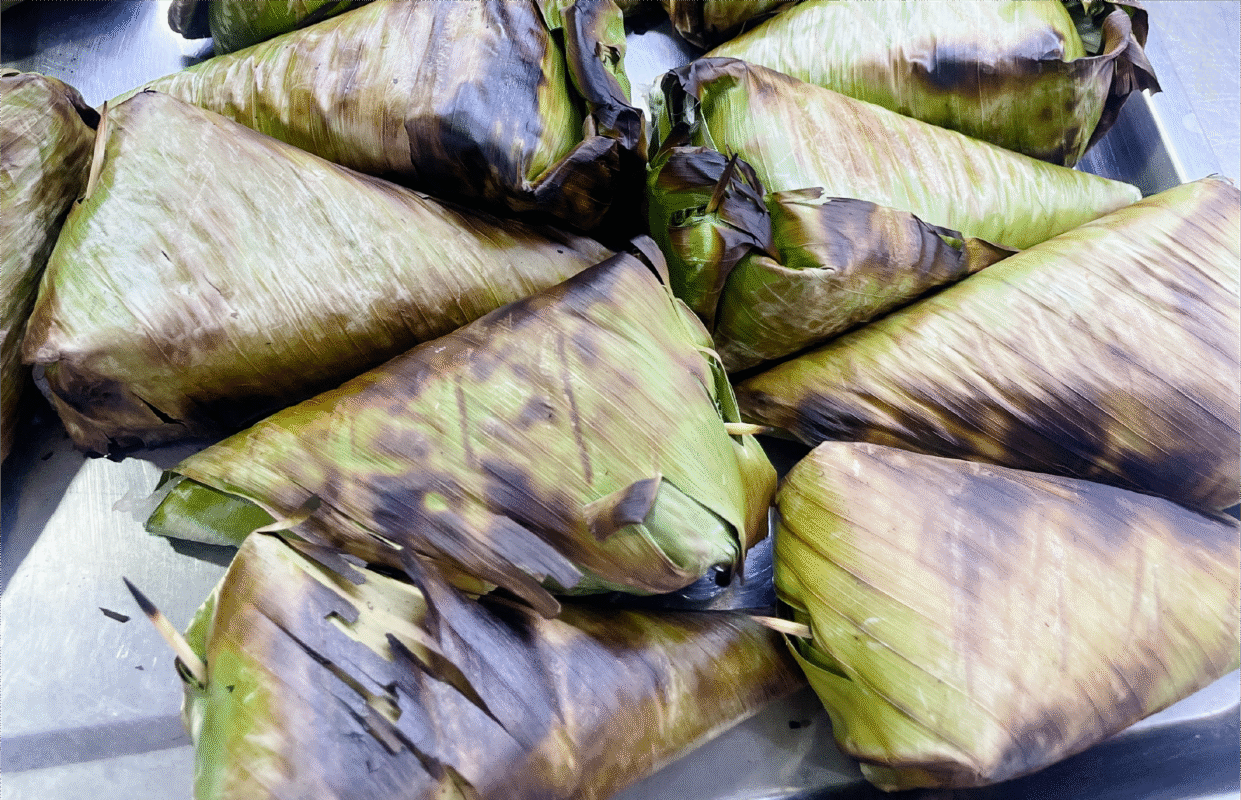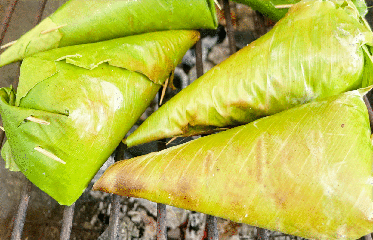 is a traditional Thai dessert made from sweetened sticky rice wrapped in banana leaves and grilled to perfection. Inside is a smooth, creamy taro filling that adds a sweet and earthy flavor. When grilled, the banana leaves give off a delightful aroma, while the outer layer of sticky rice becomes slightly crisp, contrasting beautifully with the soft taro inside. This treat is often enjoyed as a snack or dessert, perfect to pair with tea or coffee for a cozy afternoon indulgence.