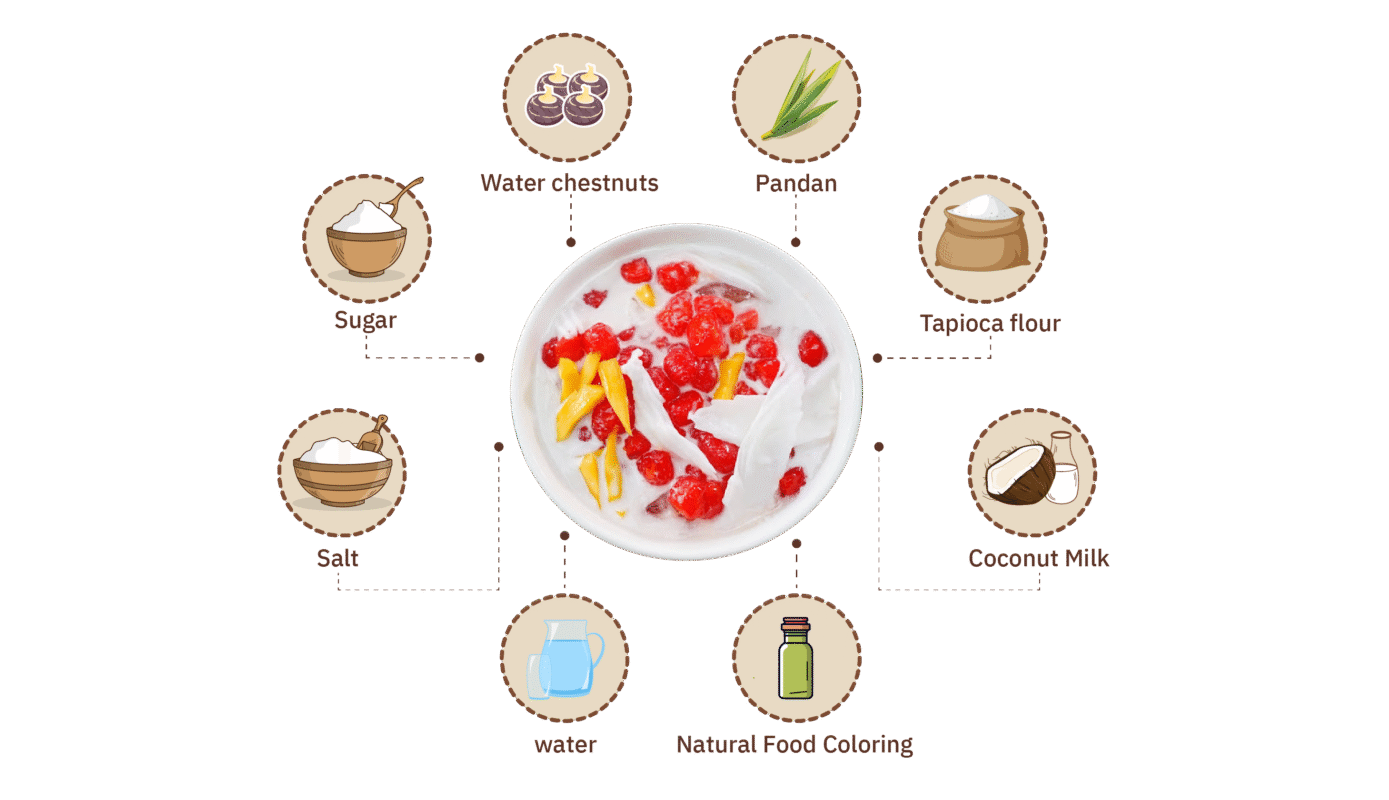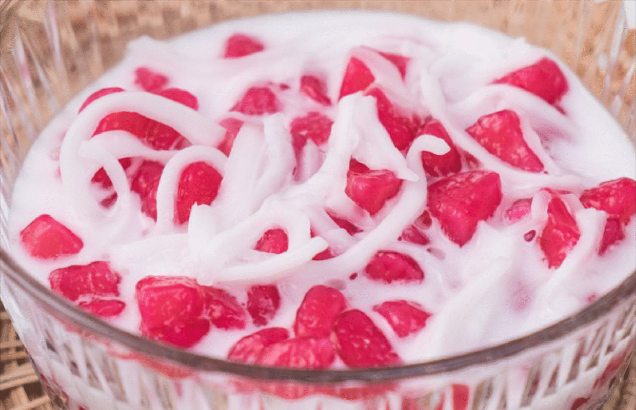 Every bite offers the satisfying chew of the tubtim krob, combined with the creamy, aromatic, and refreshing richness of the coconut milk. It is a Thai dessert that is visually beautiful, delightfully refreshing, and tender on the palate.