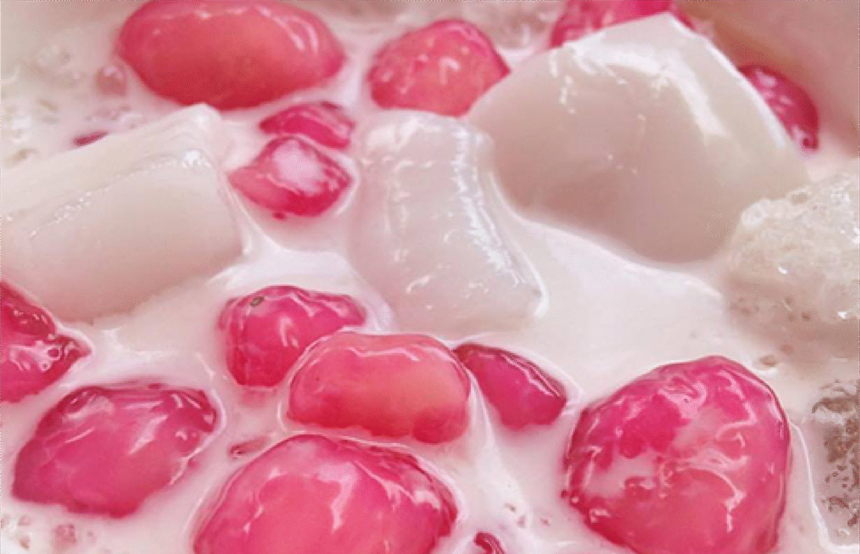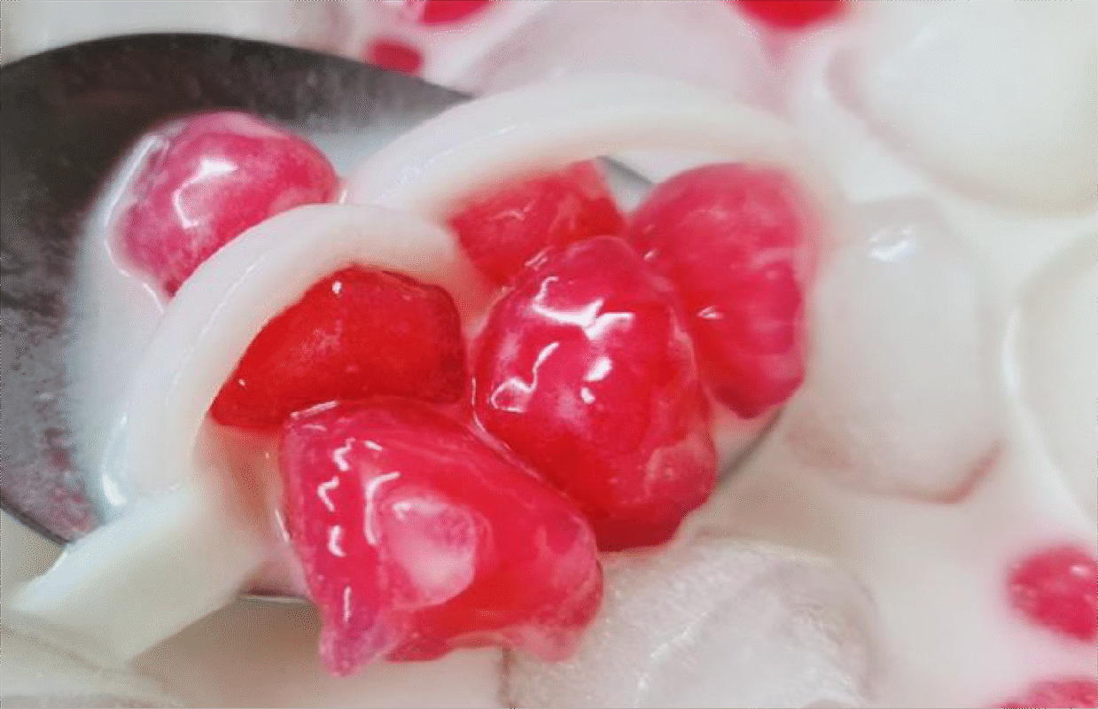 The glistening red tubtim krob pearls are made from diced water chestnuts mixed with tapioca flour, simmered until translucent. They have a pleasantly chewy, bouncy texture, like tiny red gems floating in clear syrup. They are served in slightly thickened, fragrant coconut milk, infused with the subtle aroma of pandan leaves and the gentle sweetness of palm sugar, creating a perfectly balanced flavor that is never overly sweet.