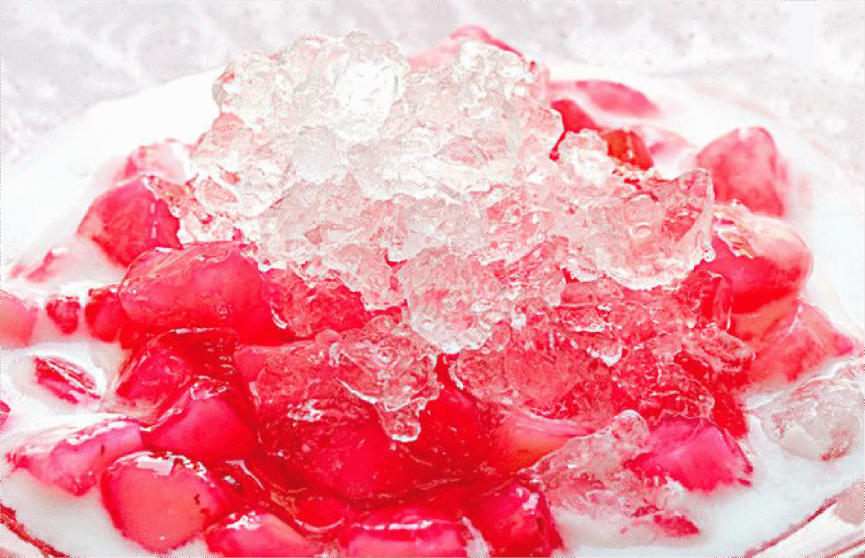 ทับทิมกรอบน้ำกะทิ : ขนมไทยยอดนิยมที่รวมความสดใสของสีสันกับความหอมมันของกะทิไว้อย่างลงตัว เม็ดทับทิมกรอบสีแดงฉ่ำ ผลิตจากแห้วหั่นเต๋าผสมกับแป้งมันสำปะหลัง เคี่ยวจนสุกใส มีสัมผัสหนึบเด้ง ราวหยดเพชรสีแดงลอยอยู่ในน้ำใส ๆ เสิร์ฟในกะทิสดหอมมันที่เคี่ยวจนข้นเล็กน้อย เติมกลิ่นหอมของใบเตยอ่อน ๆ และรสหวานละมุนของน้ำตาลมะพร้าว ทำให้รสชาติกะทิกลมกล่อม ไม่หวานจัด ทุกคำเต็มไปด้วยความหนึบของทับทิมกรอบ ผสมกับความมันหอมและเย็นสดชื่นของกะทิ เป็นขนมไทยที่ทั้งสวยงาม สดชื่น และละมุนลิ้น
