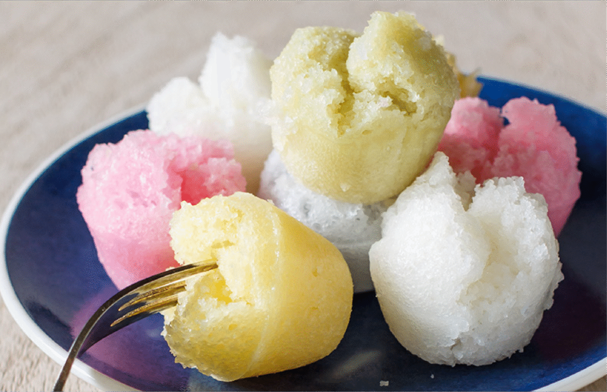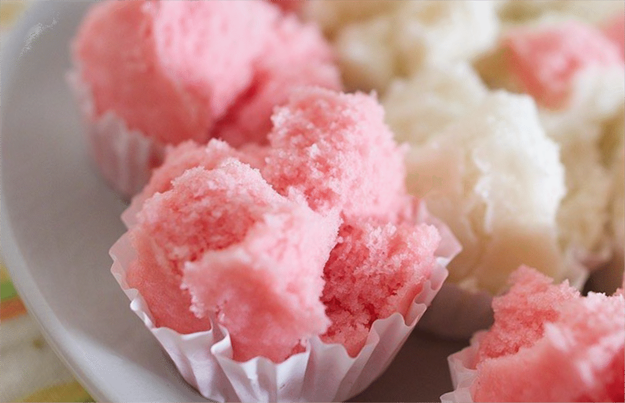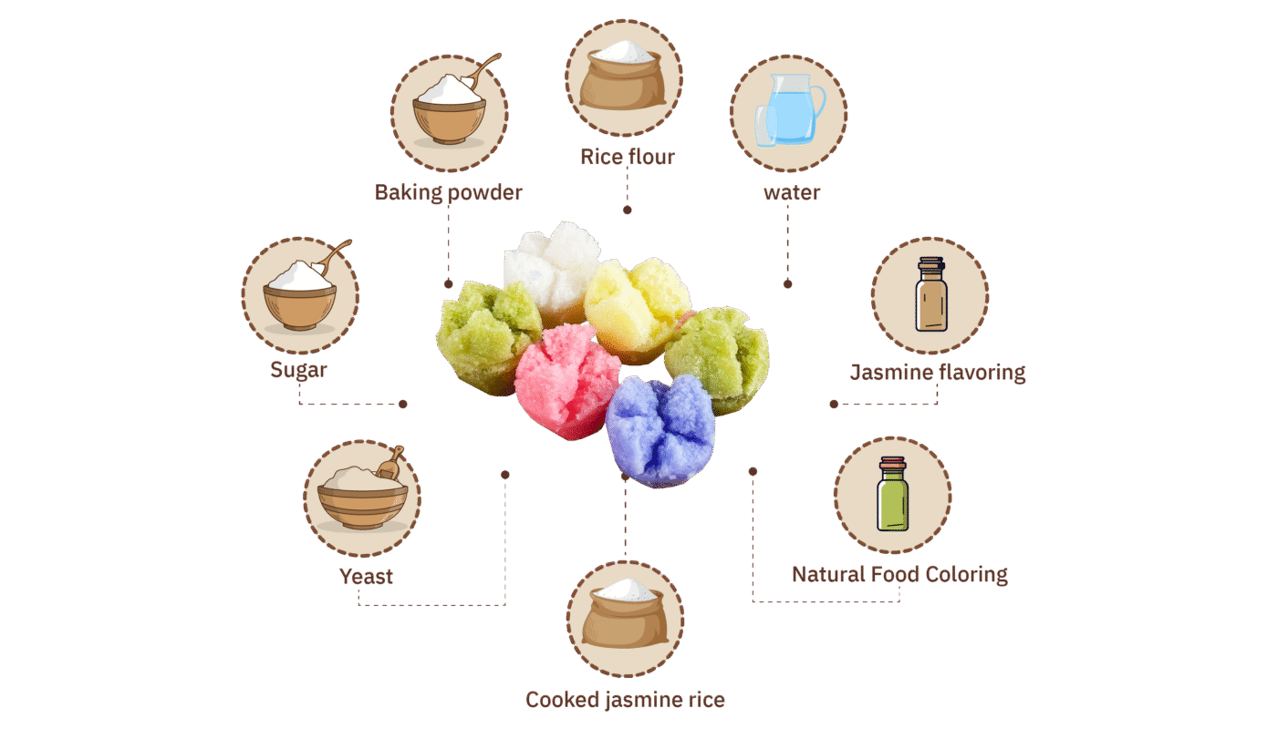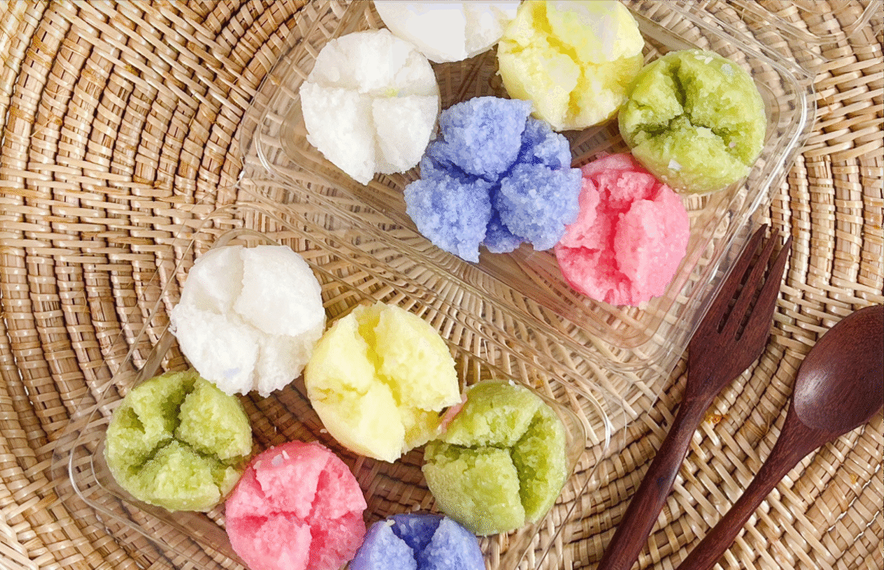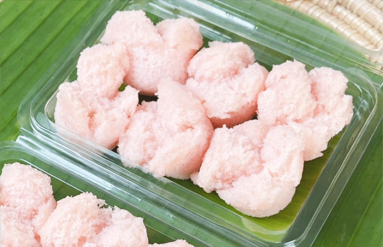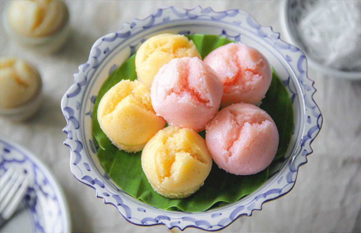 It has a texture similar to Khanom Pui Fai (Thai steamed cotton cake), with the top blooming open like petals when steamed.